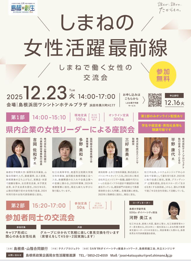 島根県は全国的にも女性の就業率が高い一方で、管理職に占める女性の割合は依然として低い水準にあります。本イベントを通じて、固定的な役割分担意識の解消や、責任ある立場で活躍できる環境づくりを考える機会とすることが期待されています。