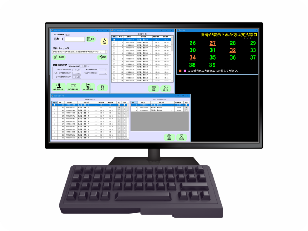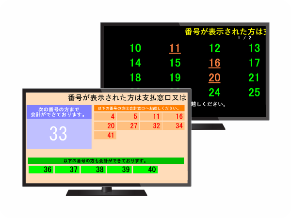 病院での診察後、会計の準備が終了した番号をモニタに表⽰し、会計誘導を⾏うシステムです。 患者様は、⼤型モニタでいつでも⾃⾝の会計状況を把握でき、スムーズな会計を⾏うことができます。