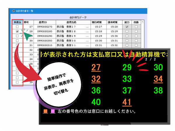患者様がお⽀払い可能になったタイミングで会計番号票に記載された番号をモニタ表⽰し、お呼び出しを⾏います。