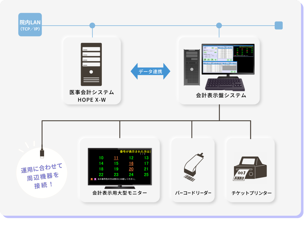 HOPE X-W(クライアントサーバ型医事システム)をはじめとした、全国で運⽤実績のある医事会計システムとの連携に特化した会計表⽰盤です。